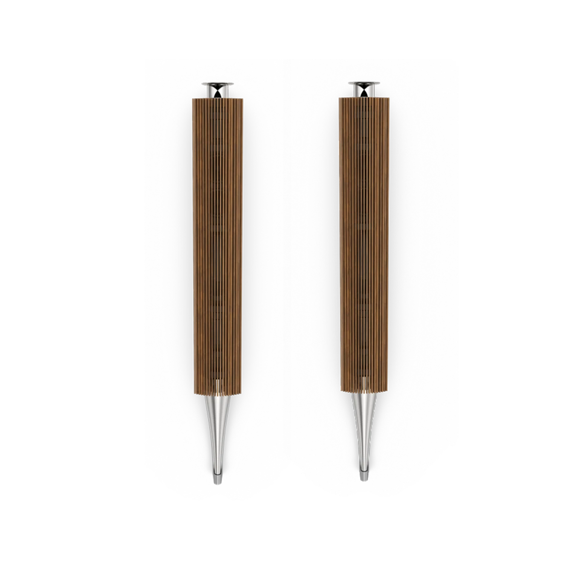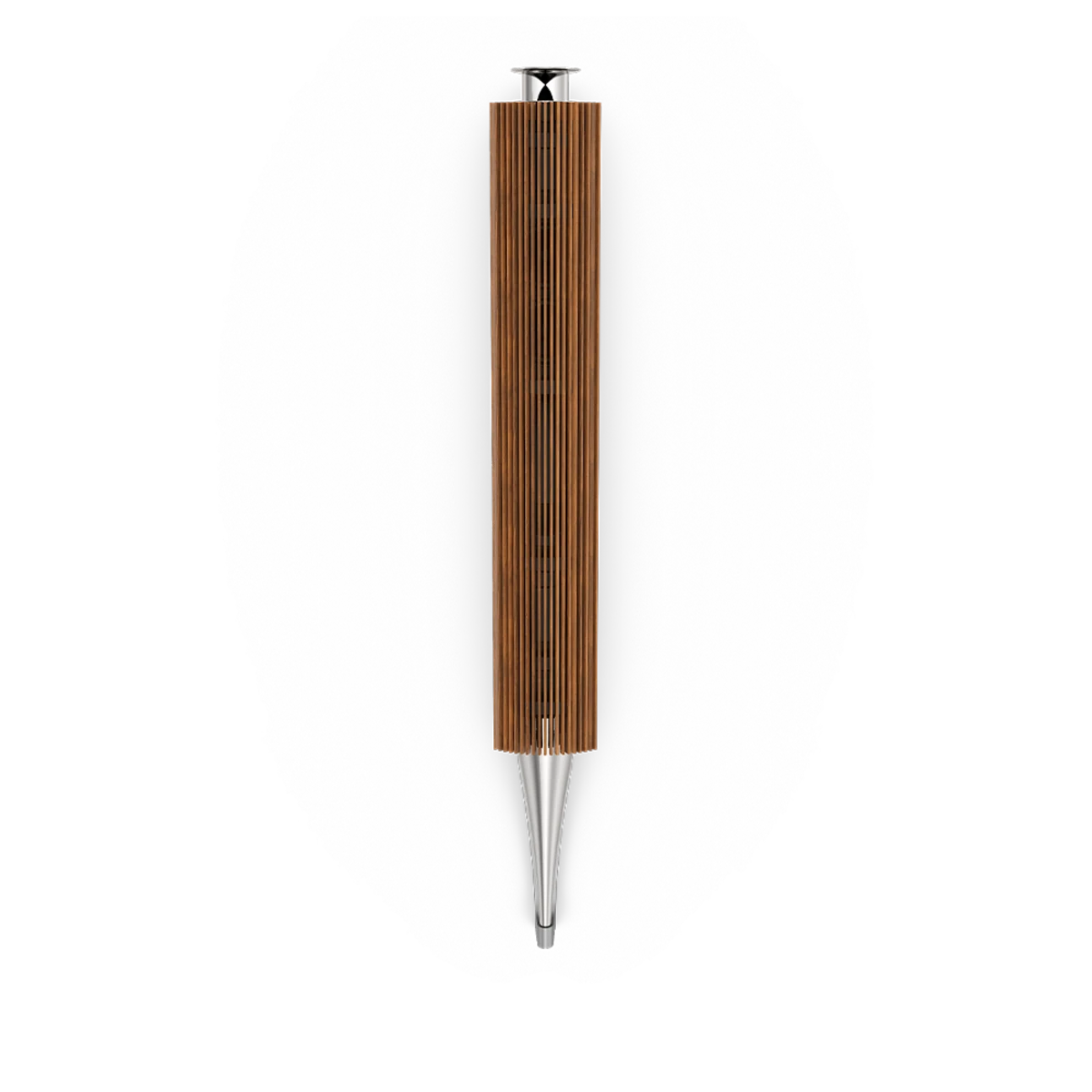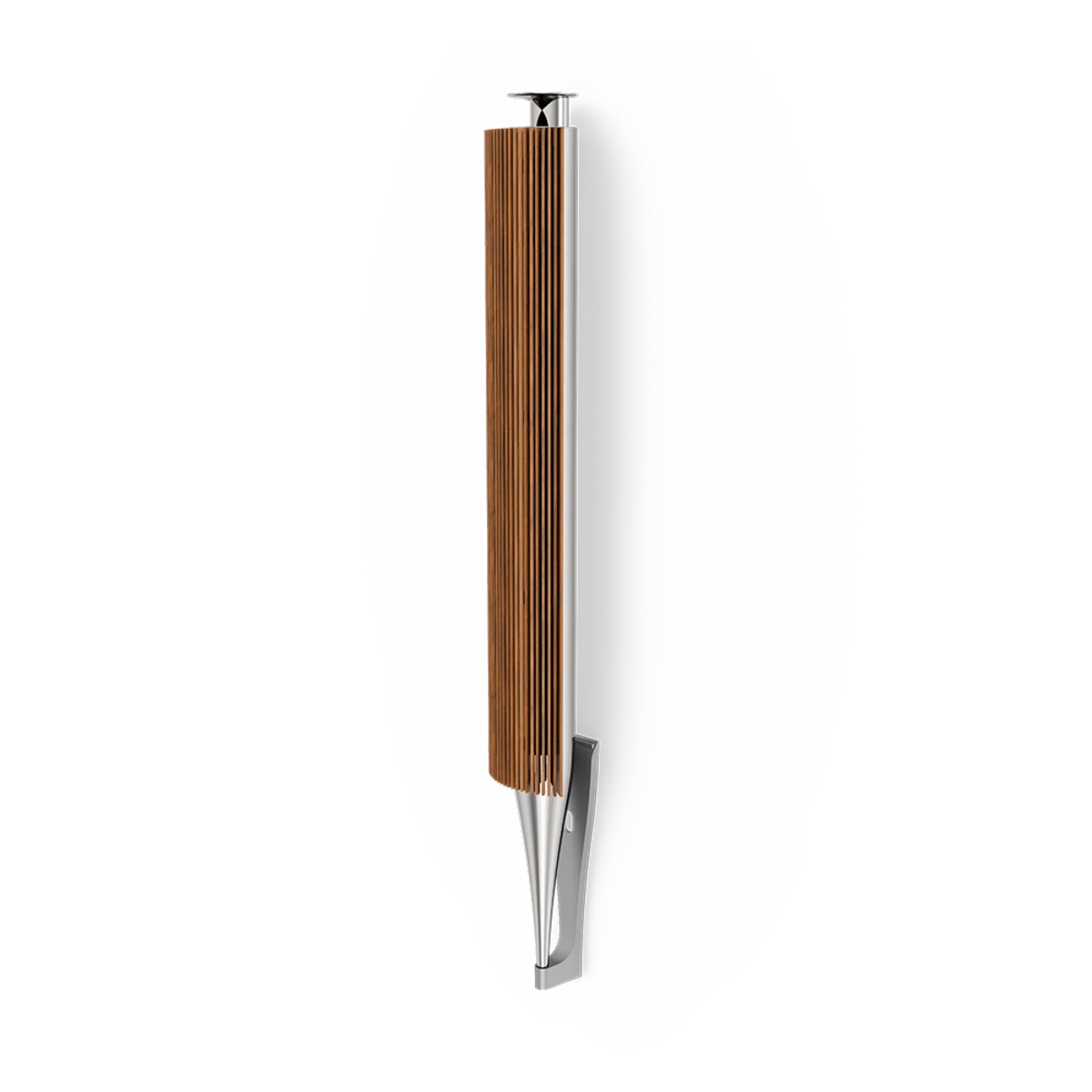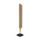 The aluminum pillar balances almost magically on its pointed base, while the crafted wooden lamellas appear to be fanning out the sound across your room in concert with the acoustic lens on top. Meet design and engineering in perfect harmony.