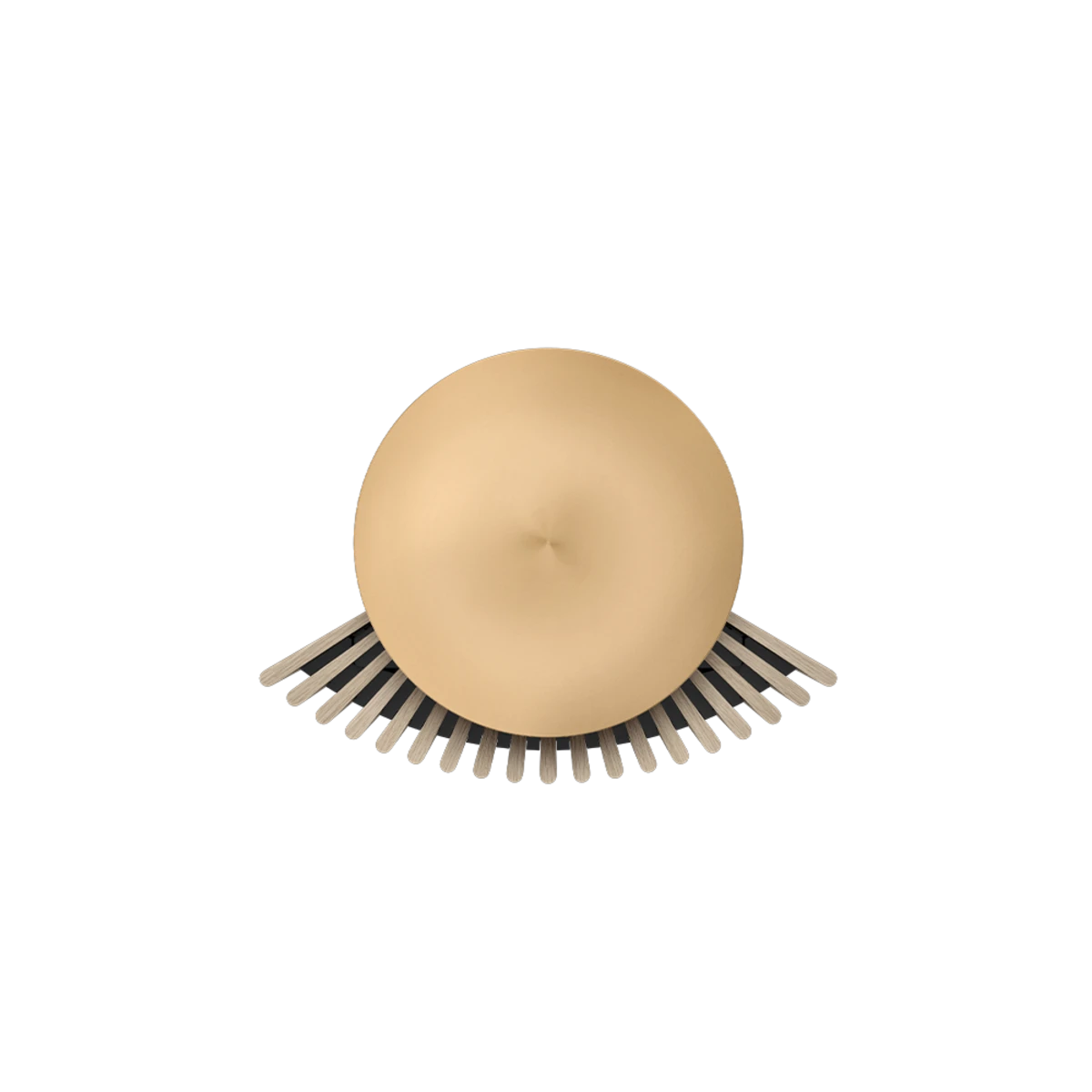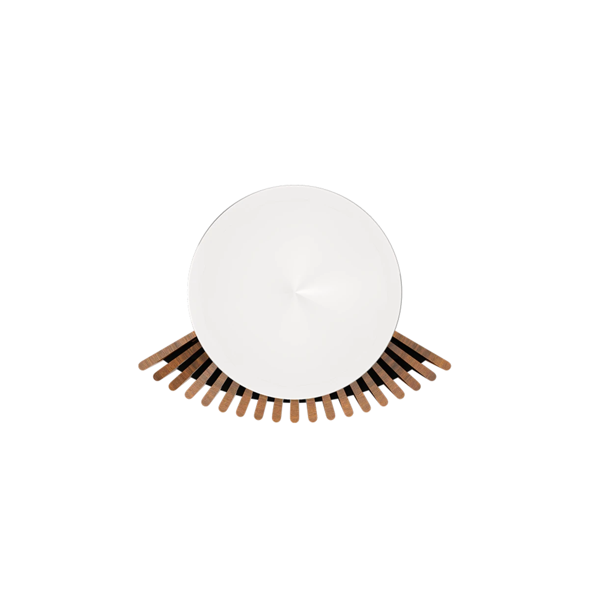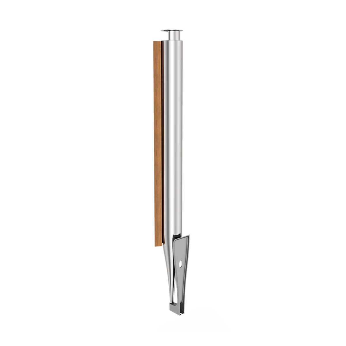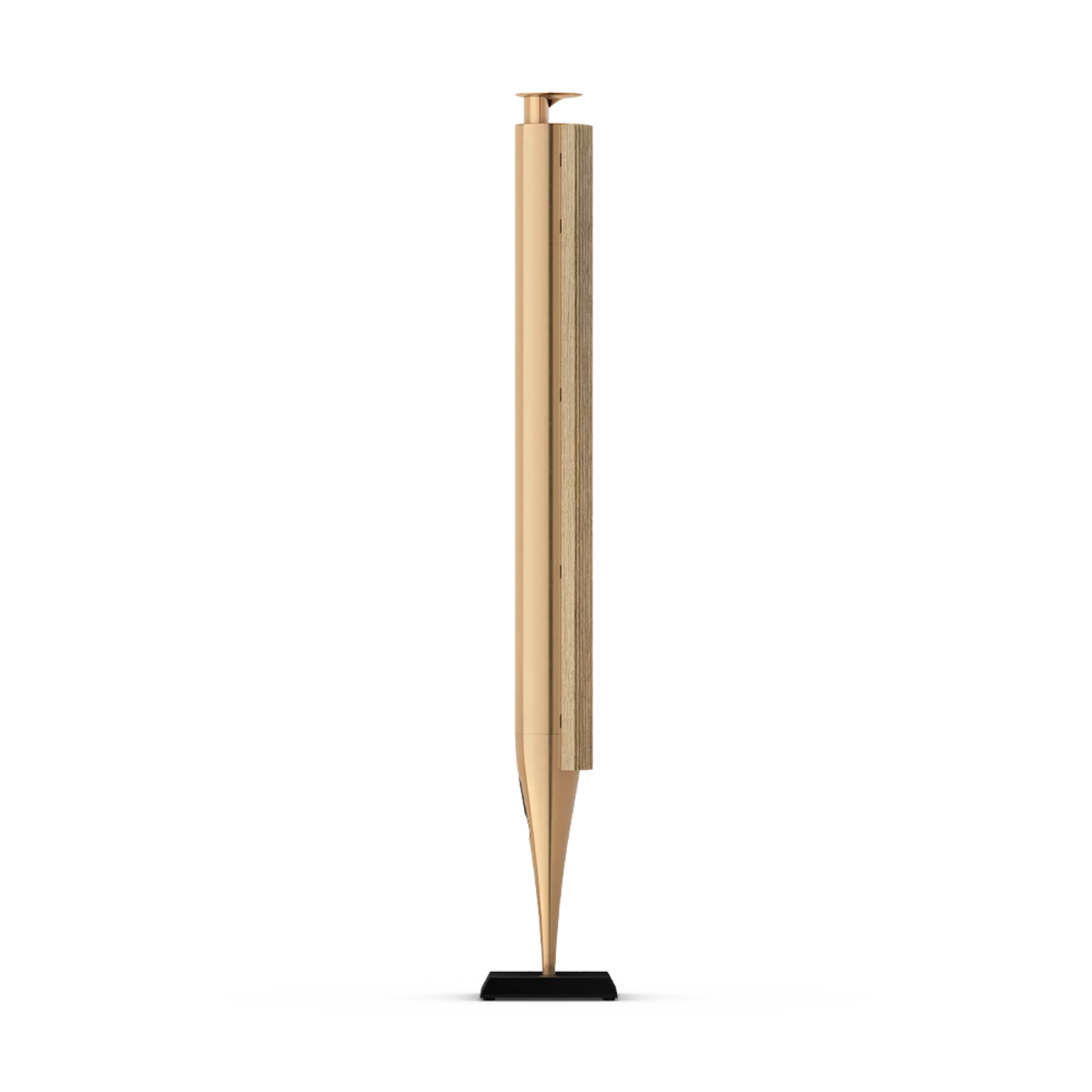 The aluminum pillar balances almost magically on its pointed base, while the crafted wooden lamellas appear to be fanning out the sound across your room in concert with the acoustic lens on top. Meet design and engineering in perfect harmony.