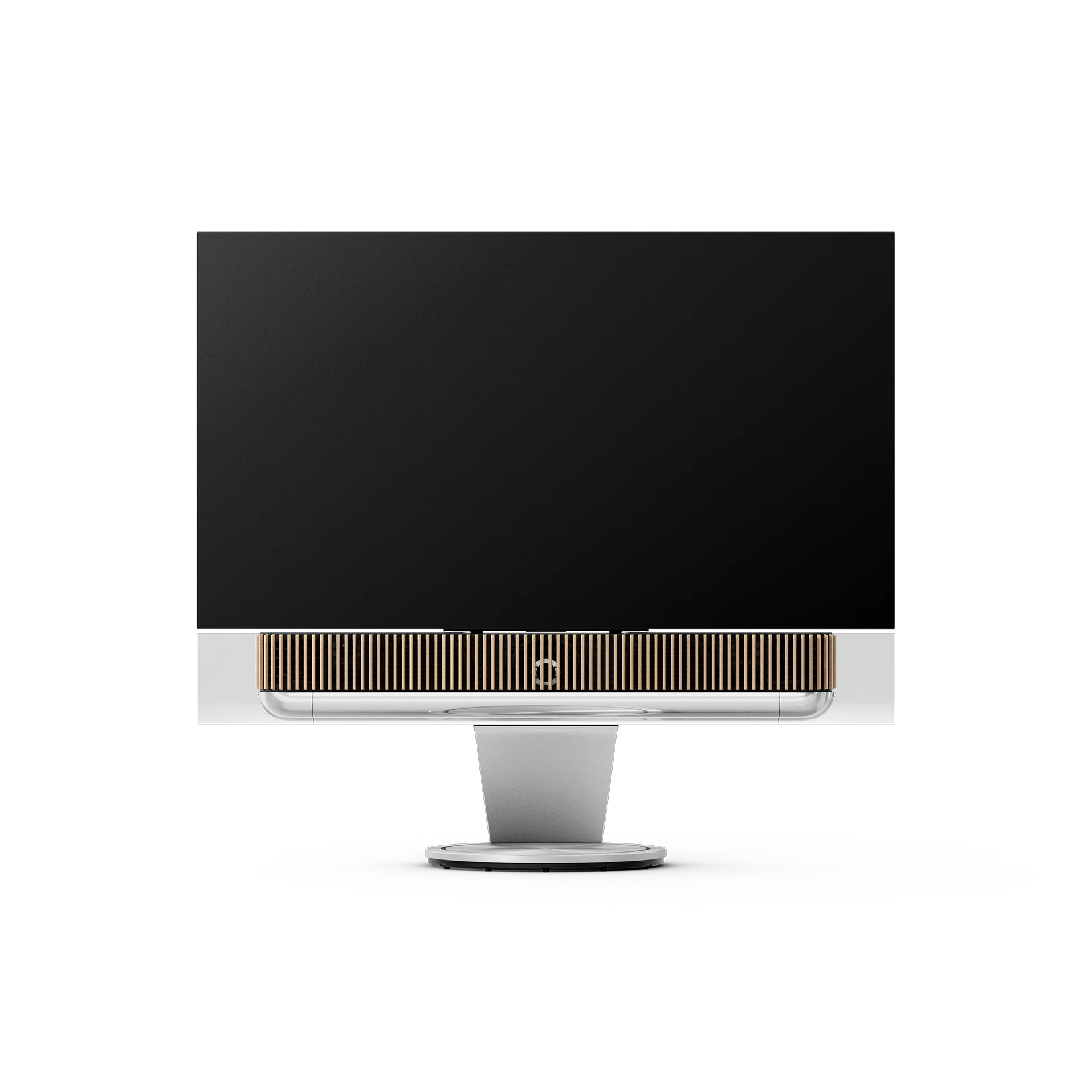 The keel-like frame with its soft curves, rests on an aluminum blade. Lamellas are made from Scandinavian oak. Soft fabric. All are crowned by an elegant screen, the size of which is up to you. Beovision Theatre makes a stage of any room.